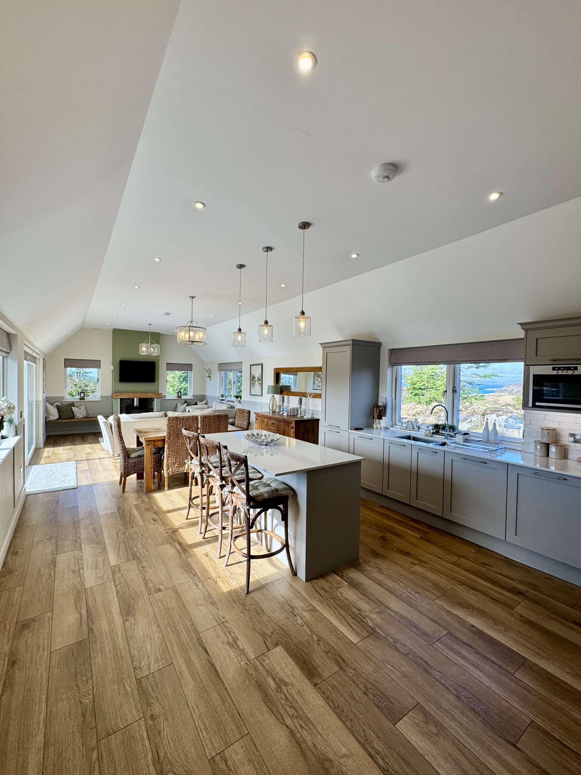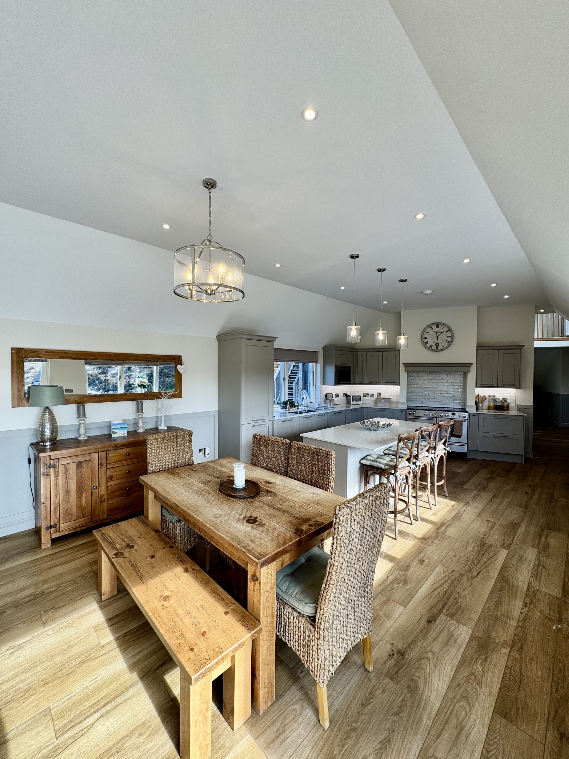 Spacious open-plan living area with a fully equipped kitchen, dining space, and a log-burning fire