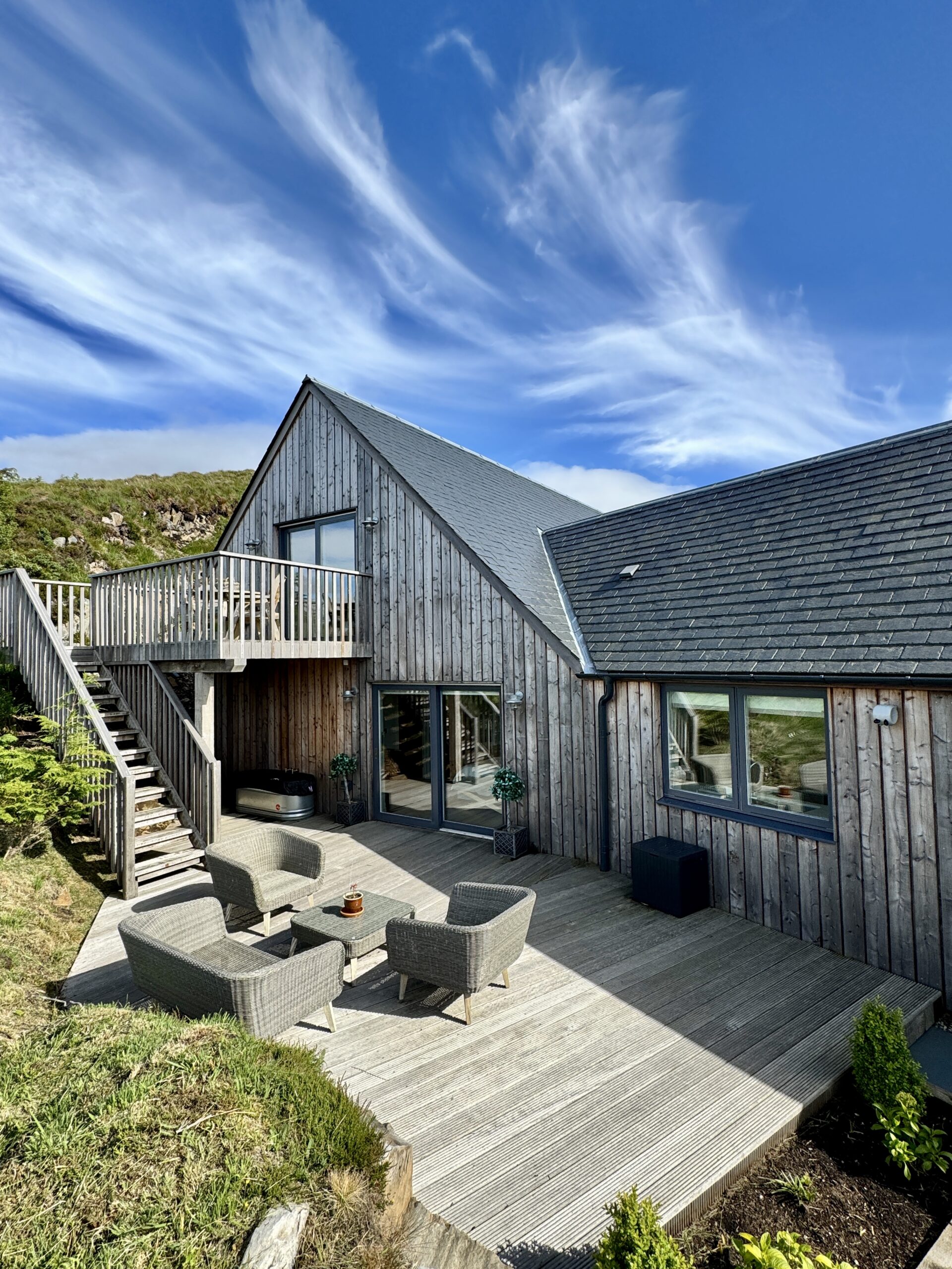 Step outside to three private decking areas, perfect for soaking in the breathtaking scenery. Unwind in the Swedish-style log-burning hot tub or a cold plunge in the dip tank at the back of the property, as you take in the stunning views of the rugged Scottish coastline.